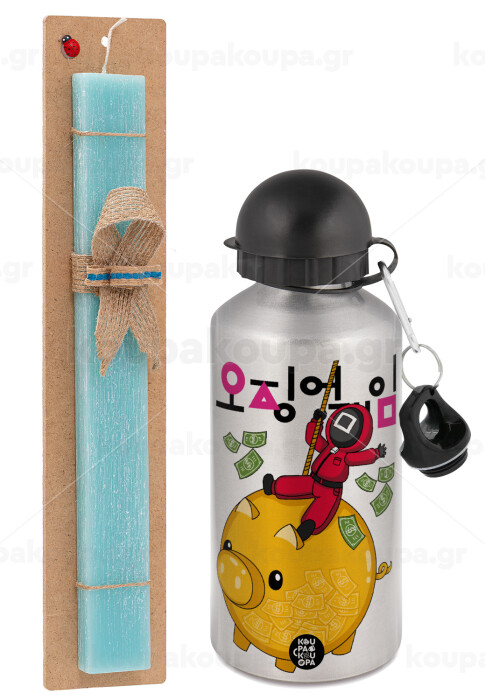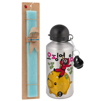 Squid game money pig, Easter Set, metallic silver aluminum water bottle (500ml) & scented flat Easter candle (30cm) (TURQUOISE)