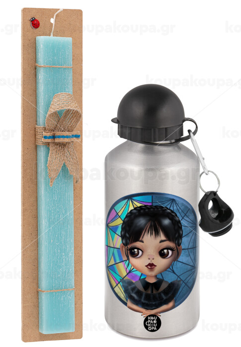 Wednesday big eyes, Easter Set, metallic silver aluminum water bottle (500ml) & scented flat Easter candle (30cm) (TURQUOISE)