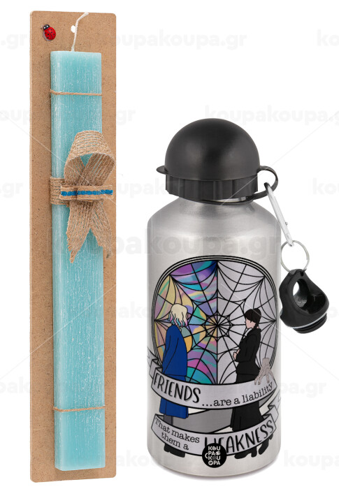 Wednesday window, Easter Set, metallic silver aluminum water bottle (500ml) & scented flat Easter candle (30cm) (TURQUOISE)