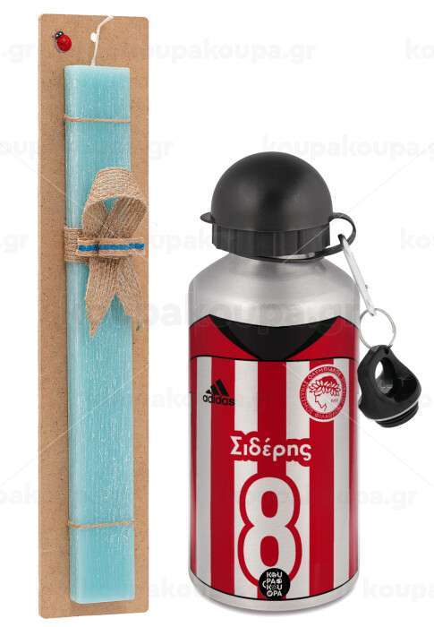 Ολυμπιακός εμφάνιση, Easter Set, metallic silver aluminum water bottle (500ml) & scented flat Easter candle (30cm) (TURQUOISE)
