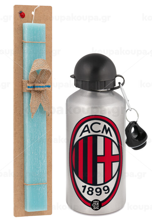 ACM, Easter Set, metallic silver aluminum water bottle (500ml) & scented flat Easter candle (30cm) (TURQUOISE)