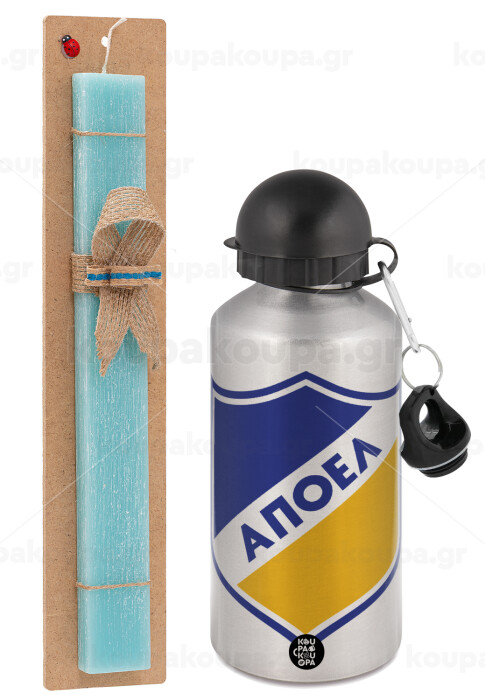 FC ΑΠΟΕΛ Λευκωσίας, Easter Set, metallic silver aluminum water bottle (500ml) & scented flat Easter candle (30cm) (TURQUOISE)