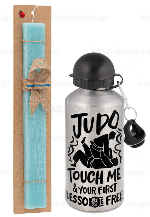 Judo Touch Me And Your First Lesson Is Free, Easter Set, metallic silver aluminum water bottle (500ml) & scented flat Easter candle (30cm) (TURQUOISE)