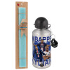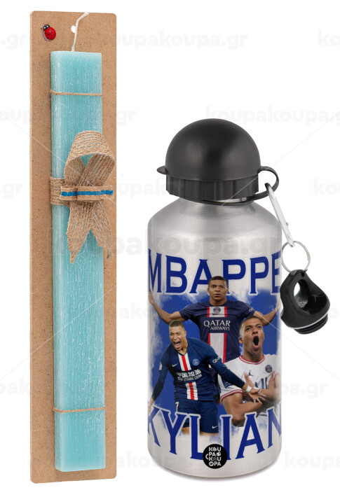 Kylian Mbappé, Easter Set, metallic silver aluminum water bottle (500ml) & scented flat Easter candle (30cm) (TURQUOISE)