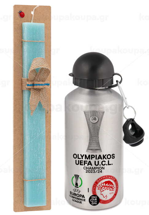 Olympiacos UEFA Europa Conference League Champion 2023/24, Easter Set, metallic silver aluminum water bottle (500ml) & scented flat Easter candle (30cm) (TURQUOISE)