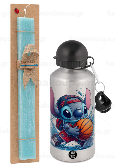 Stitch Basketball, Easter Set, metallic silver aluminum water bottle (500ml) & scented flat Easter candle (30cm) (TURQUOISE)