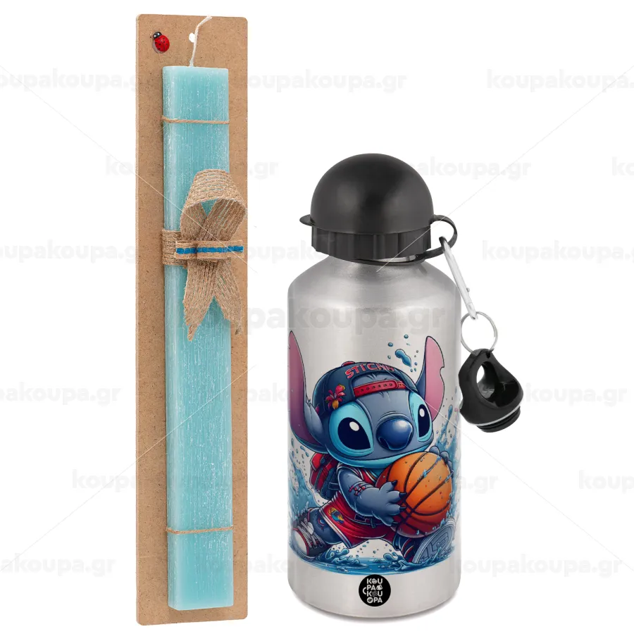 Stitch Basketball, Easter Set, metallic silver aluminum water bottle (500ml) & scented flat Easter candle (30cm) (TURQUOISE)