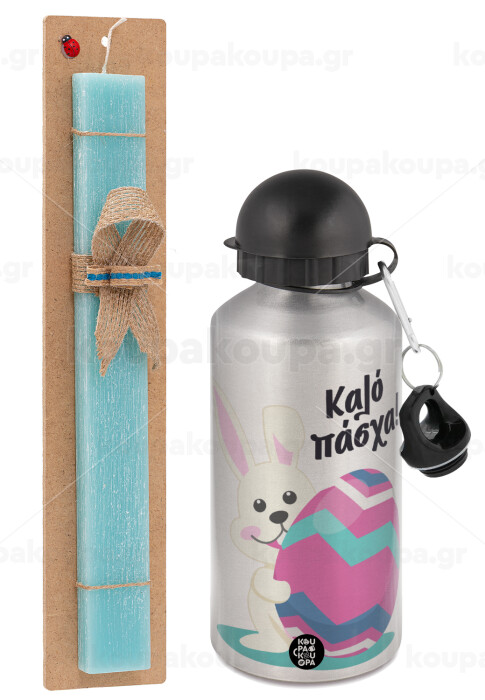 Καλό πάσχα, Easter Set, metallic silver aluminum water bottle (500ml) & scented flat Easter candle (30cm) (TURQUOISE)