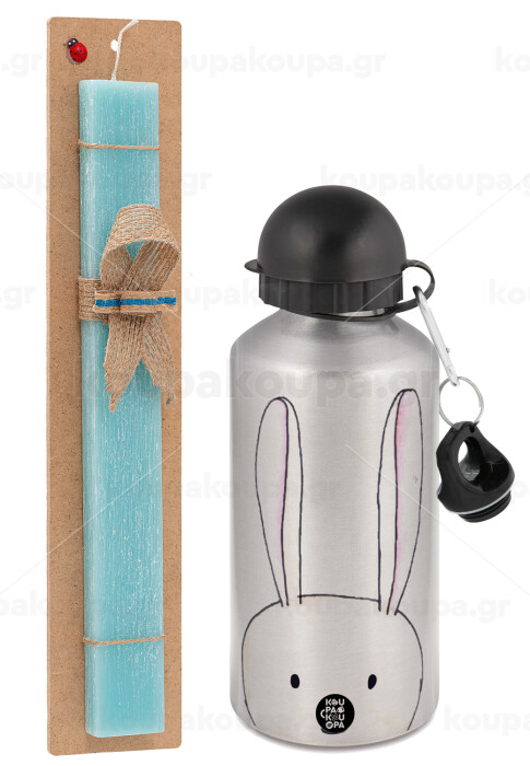 Ο λαγός του πάσχα, Easter Set, metallic silver aluminum water bottle (500ml) & scented flat Easter candle (30cm) (TURQUOISE)