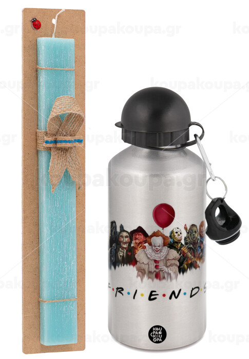 Halloween Friends, Easter Set, metallic silver aluminum water bottle (500ml) & scented flat Easter candle (30cm) (TURQUOISE)