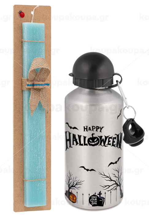 Happy Halloween cemetery, Easter Set, metallic silver aluminum water bottle (500ml) & scented flat Easter candle (30cm) (TURQUOISE)