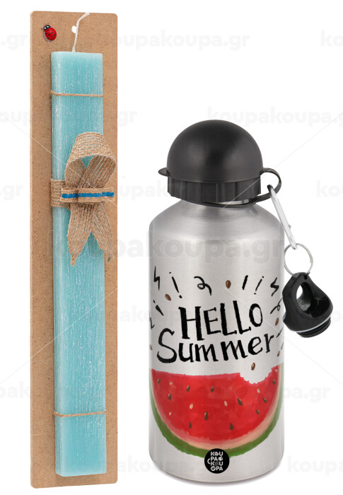 Summer Watermelon, Easter Set, metallic silver aluminum water bottle (500ml) & scented flat Easter candle (30cm) (TURQUOISE)