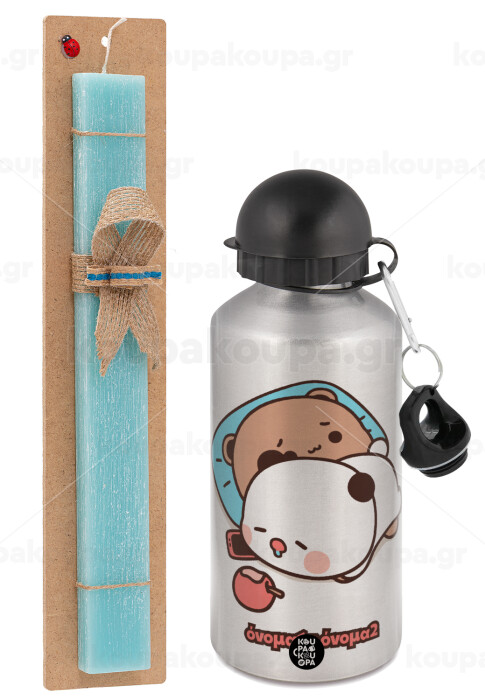 bubu + dudu, Easter Set, metallic silver aluminum water bottle (500ml) & scented flat Easter candle (30cm) (TURQUOISE)