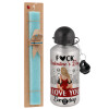 I love You Everyday , Easter Set, metallic silver aluminum water bottle (500ml) & scented flat Easter candle (30cm) (TURQUOISE)