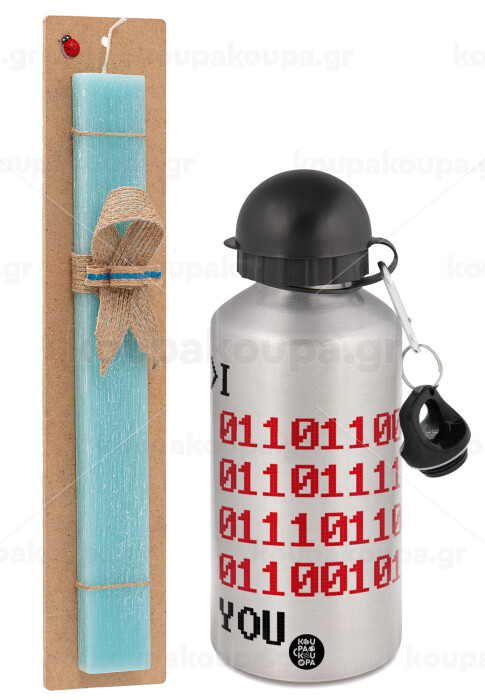 I .... YOU, binary secret MSG, Easter Set, metallic silver aluminum water bottle (500ml) & scented flat Easter candle (30cm) (TURQUOISE)
