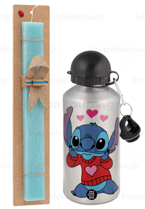 Stitch heart, Easter Set, metallic silver aluminum water bottle (500ml) & scented flat Easter candle (30cm) (TURQUOISE)