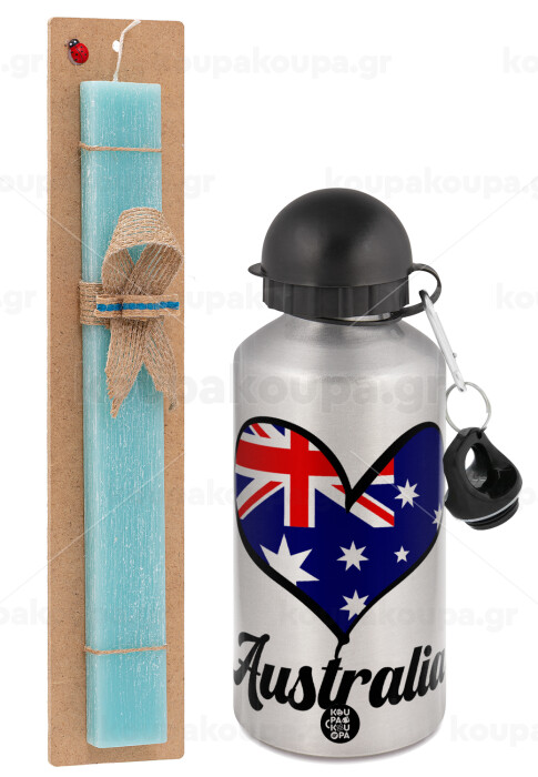 Australia flag, Easter Set, metallic silver aluminum water bottle (500ml) & scented flat Easter candle (30cm) (TURQUOISE)