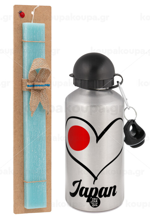 Japan flag, Easter Set, metallic silver aluminum water bottle (500ml) & scented flat Easter candle (30cm) (TURQUOISE)