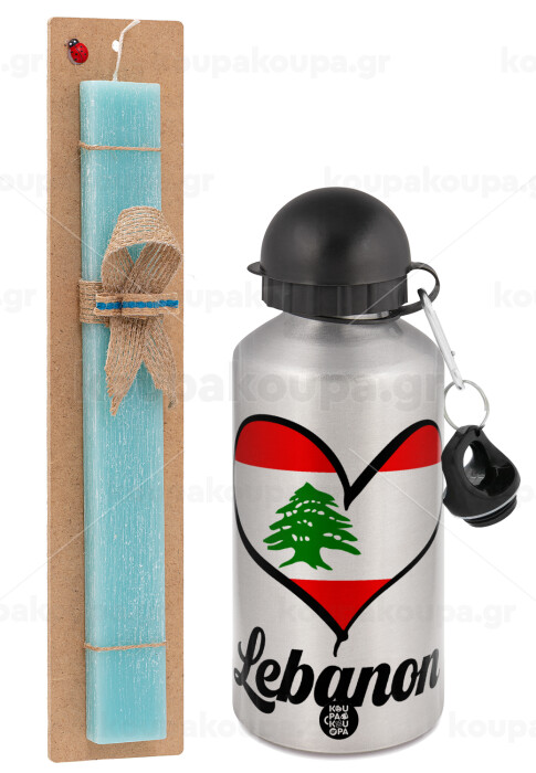 Lebanon flag, Easter Set, metallic silver aluminum water bottle (500ml) & scented flat Easter candle (30cm) (TURQUOISE)