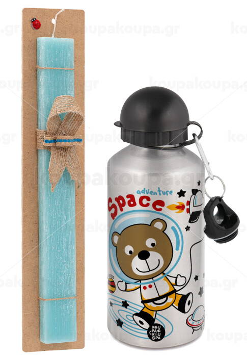Kids Space, Easter Set, metallic silver aluminum water bottle (500ml) & scented flat Easter candle (30cm) (TURQUOISE)