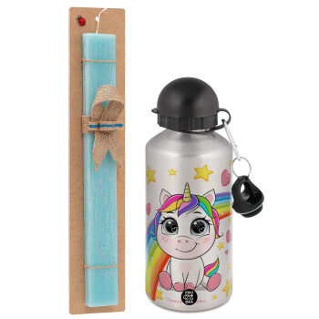 Unicorn baby με όνομα, Easter Set, metallic silver aluminum water bottle (500ml) & scented flat Easter candle (30cm) (TURQUOISE)