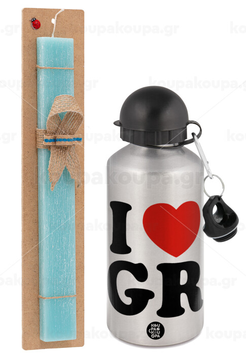 I Love GR, Easter Set, metallic silver aluminum water bottle (500ml) & scented flat Easter candle (30cm) (TURQUOISE)
