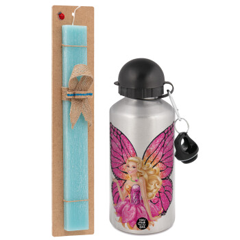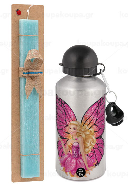 A fairy Barbie, Easter Set, metallic silver aluminum water bottle (500ml) & scented flat Easter candle (30cm) (TURQUOISE)