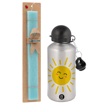 Happy sun, Easter Set, metallic silver aluminum water bottle (500ml) & scented flat Easter candle (30cm) (TURQUOISE)