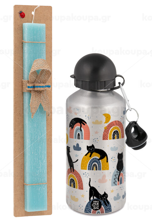 Γατούλες, Easter Set, metallic silver aluminum water bottle (500ml) & scented flat Easter candle (30cm) (TURQUOISE)