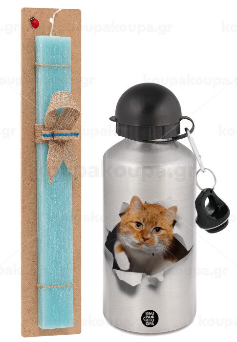 Cat cracked, Easter Set, metallic silver aluminum water bottle (500ml) & scented flat Easter candle (30cm) (TURQUOISE)