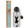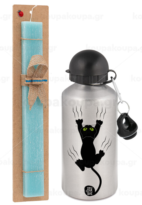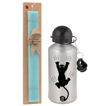 cat grabbing, Easter Set, metallic silver aluminum water bottle (500ml) & scented flat Easter candle (30cm) (TURQUOISE)
