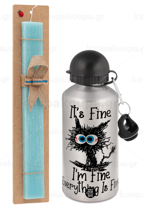 Cat, It's Fine I'm Fine Everything Is Fine, Easter Set, metallic silver aluminum water bottle (500ml) & scented flat Easter candle (30cm) (TURQUOISE)