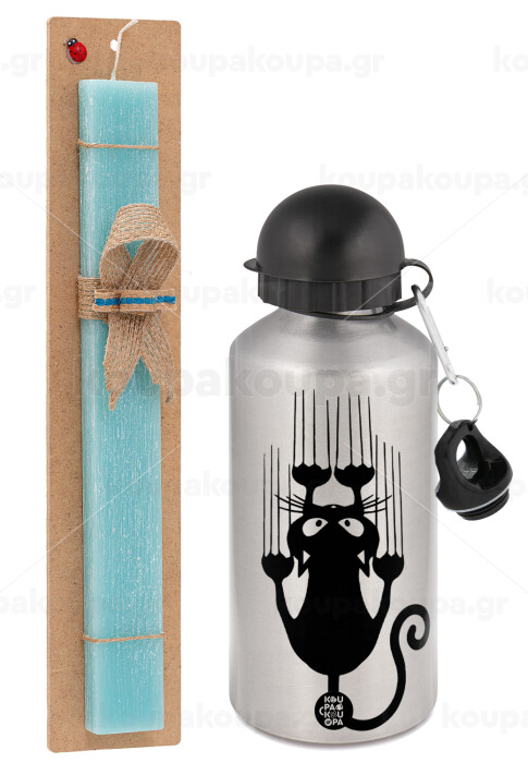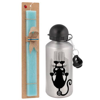Cat scratching, Easter Set, metallic silver aluminum water bottle (500ml) & scented flat Easter candle (30cm) (TURQUOISE)
