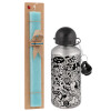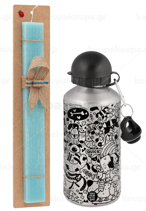 DOG pattern, Easter Set, metallic silver aluminum water bottle (500ml) & scented flat Easter candle (30cm) (TURQUOISE)