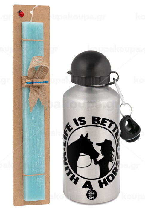 Life is Better with a Horse, Easter Set, metallic silver aluminum water bottle (500ml) & scented flat Easter candle (30cm) (TURQUOISE)