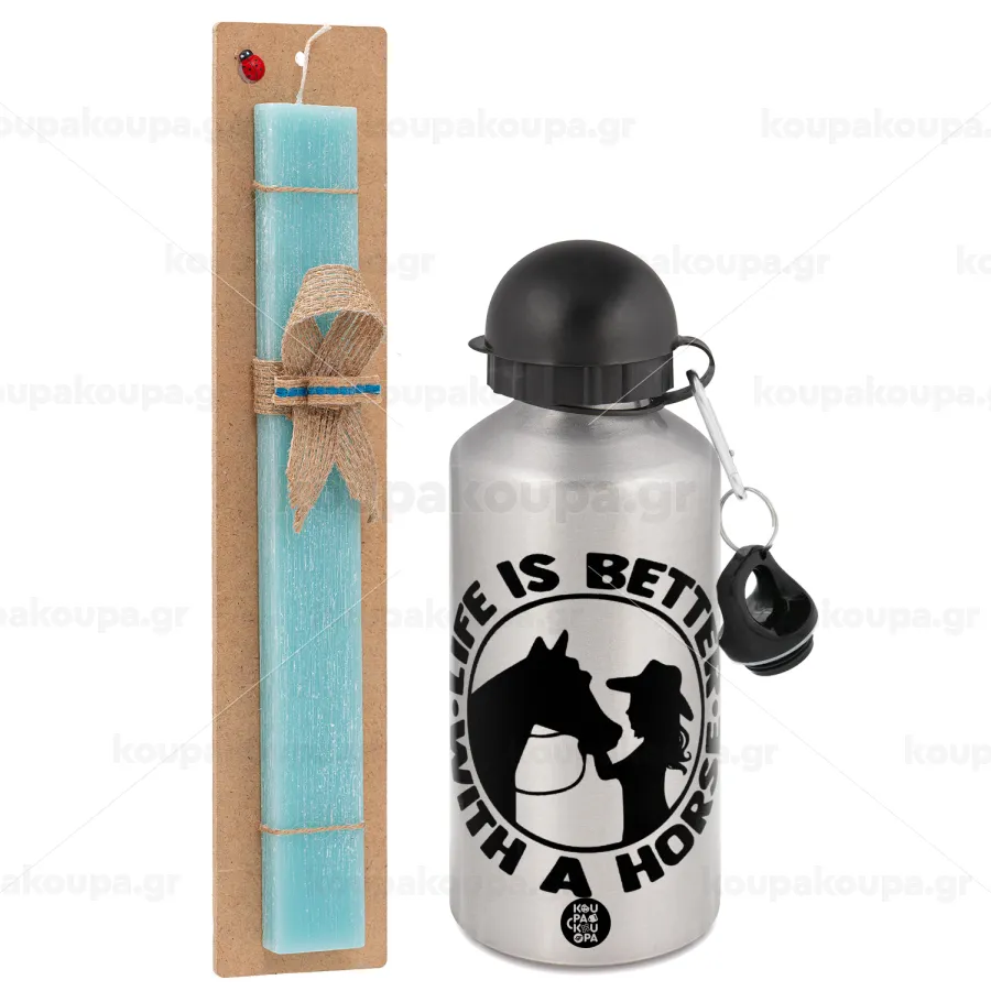 Life is Better with a Horse, Easter Set, metallic silver aluminum water bottle (500ml) & scented flat Easter candle (30cm) (TURQUOISE)