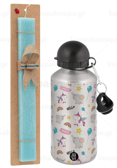 Happy Clouds Doodle, Easter Set, metallic silver aluminum water bottle (500ml) & scented flat Easter candle (30cm) (TURQUOISE)