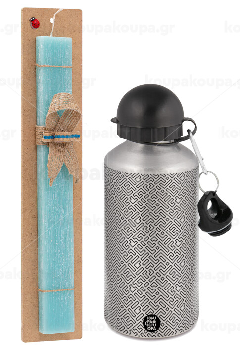 Doodle Maze, Easter Set, metallic silver aluminum water bottle (500ml) & scented flat Easter candle (30cm) (TURQUOISE)