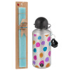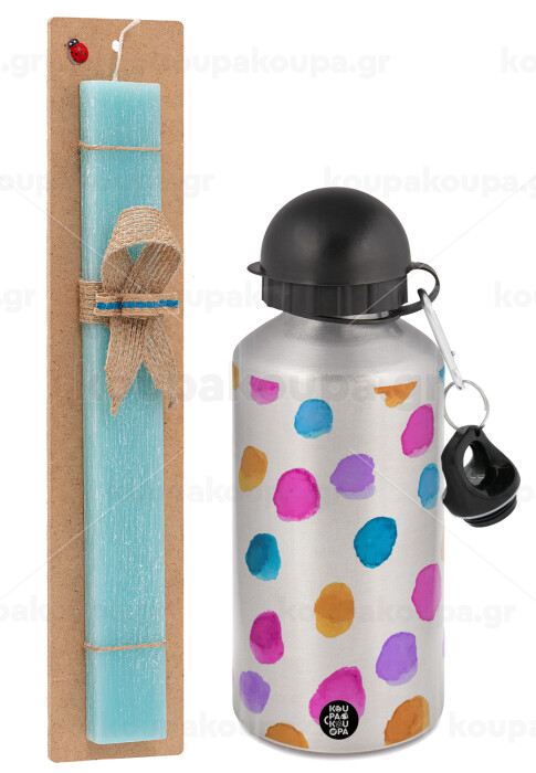 Watercolor dots, Easter Set, metallic silver aluminum water bottle (500ml) & scented flat Easter candle (30cm) (TURQUOISE)