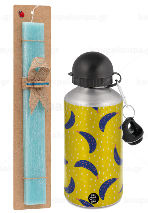 Yellow seamless with blue bananas, Easter Set, metallic silver aluminum water bottle (500ml) & scented flat Easter candle (30cm) (TURQUOISE)