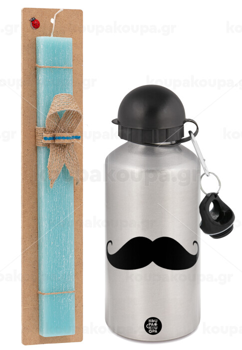 moustache, Easter Set, metallic silver aluminum water bottle (500ml) & scented flat Easter candle (30cm) (TURQUOISE)
