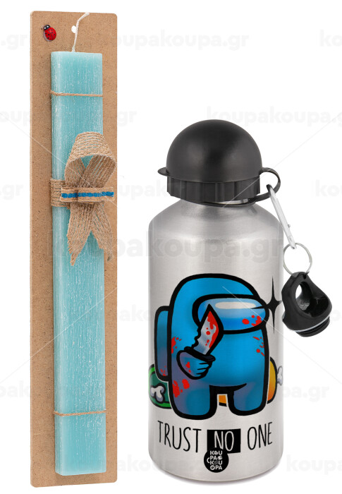 Among Trust no one, Easter Set, metallic silver aluminum water bottle (500ml) & scented flat Easter candle (30cm) (TURQUOISE)