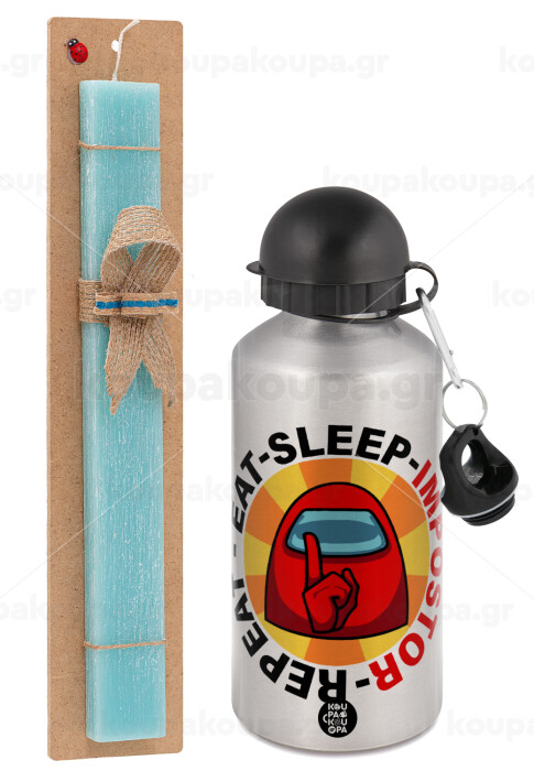 Among US Eat Sleep Repeat Impostor, Easter Set, metallic silver aluminum water bottle (500ml) & scented flat Easter candle (30cm) (TURQUOISE)