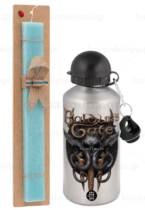 Baldur's Gate, Easter Set, metallic silver aluminum water bottle (500ml) & scented flat Easter candle (30cm) (TURQUOISE)