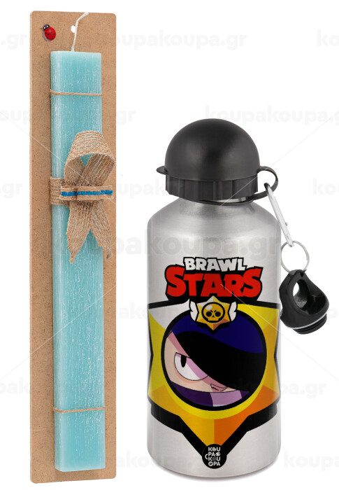 Brawl Stars Edgar, Easter Set, metallic silver aluminum water bottle (500ml) & scented flat Easter candle (30cm) (TURQUOISE)