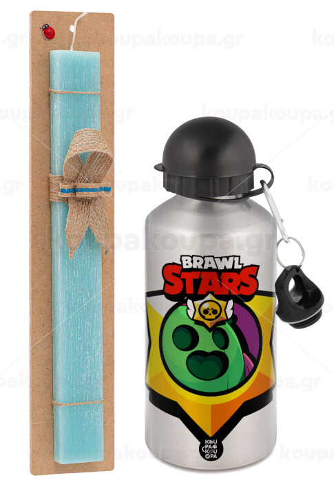 Brawl Stars Spike, Easter Set, metallic silver aluminum water bottle (500ml) & scented flat Easter candle (30cm) (TURQUOISE)
