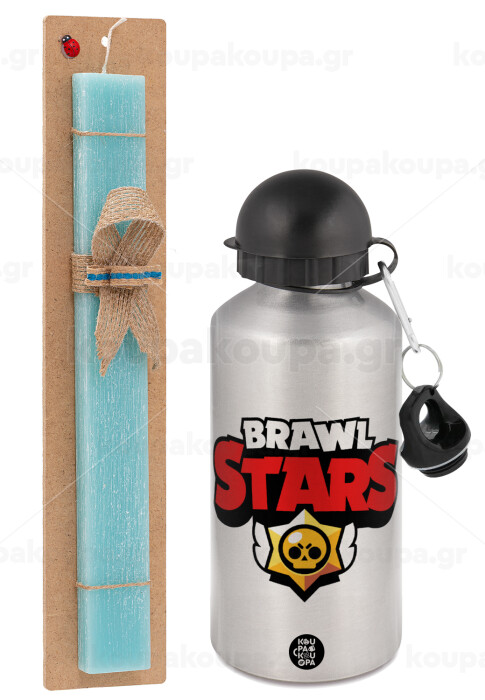 Brawl Stars, Easter Set, metallic silver aluminum water bottle (500ml) & scented flat Easter candle (30cm) (TURQUOISE)