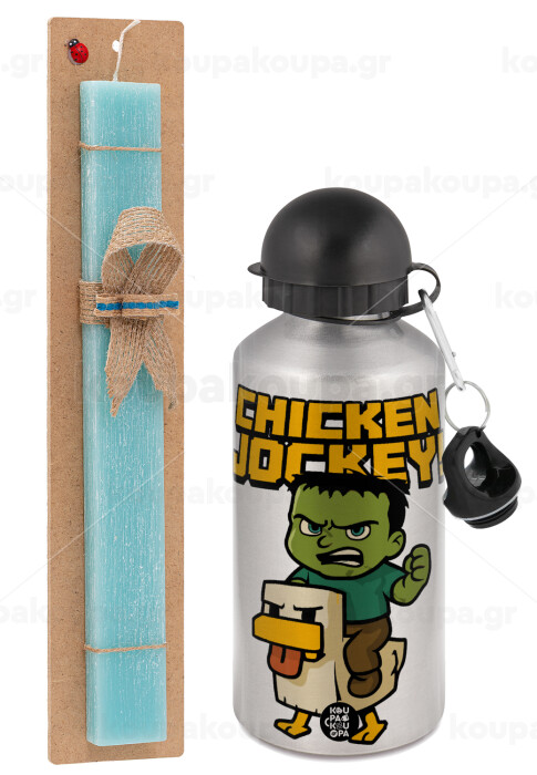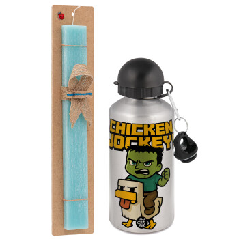 Chicken Jockey, Easter Set, metallic silver aluminum water bottle (500ml) & scented flat Easter candle (30cm) (TURQUOISE)