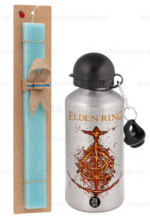 Elden Ring, Easter Set, metallic silver aluminum water bottle (500ml) & scented flat Easter candle (30cm) (TURQUOISE)