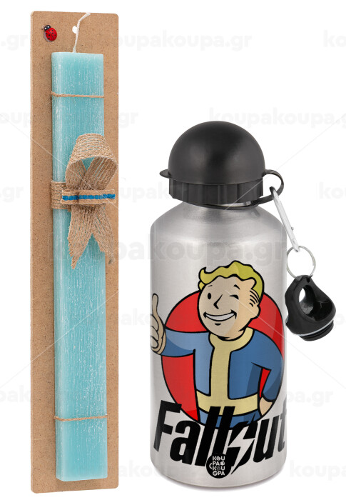 Fallout Vault Boy, Easter Set, metallic silver aluminum water bottle (500ml) & scented flat Easter candle (30cm) (TURQUOISE)